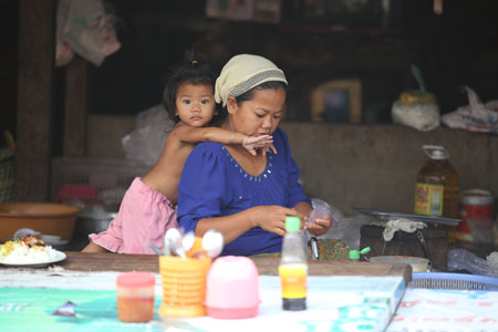 これから朝食のようです。女の子がお母さんに甘えていました。